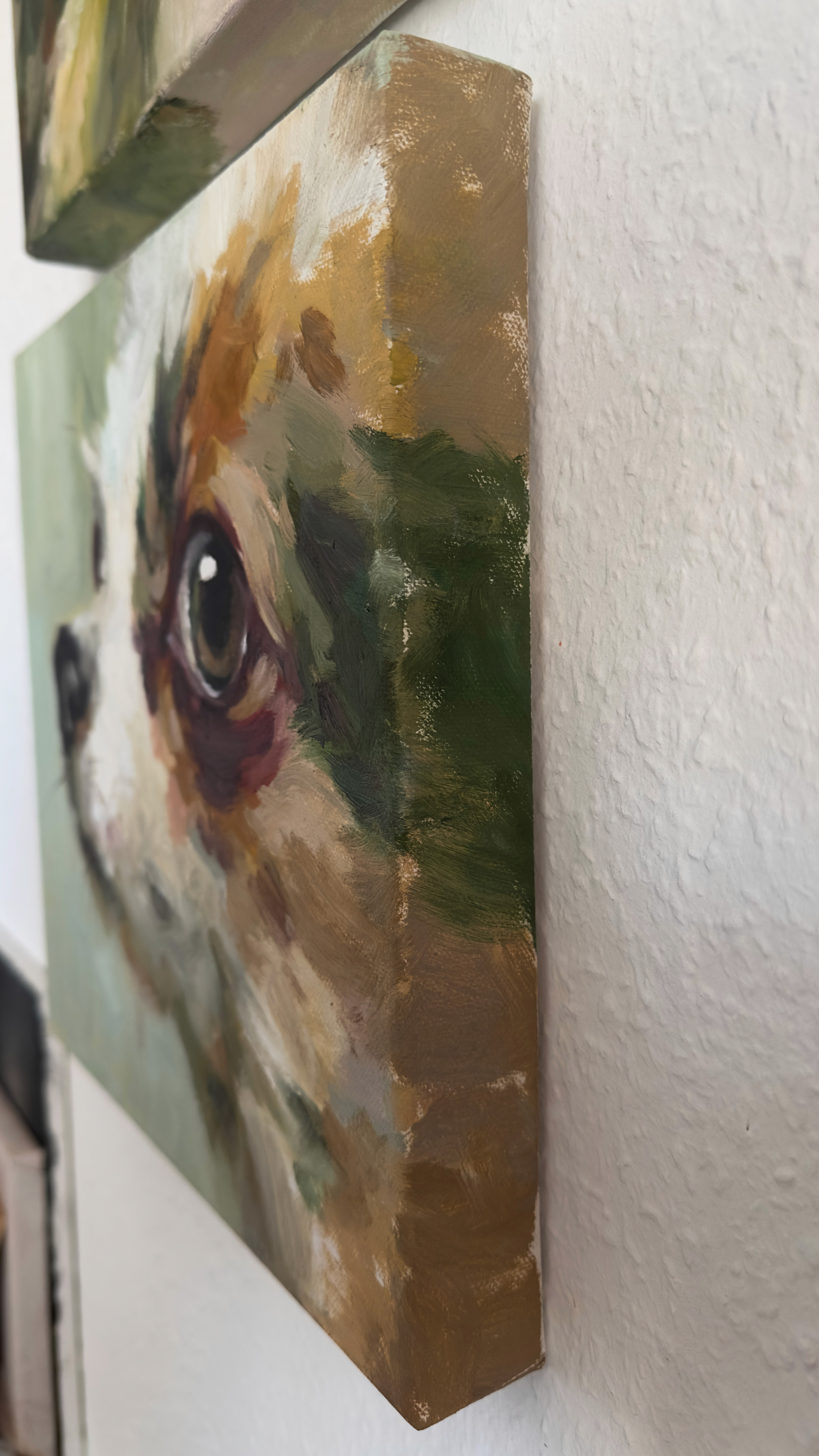 Die Malerei ist bewusst offen und lebendig gehalten: sichtbare Pinselstriche, weiche Übergänge und differenzierte Farbtöne erzeugen Tiefe und Bewegung. Die reduzierte Hintergrundfläche lenkt den Blick vollständig auf den Ausdruck des Tieres und verstärkt die emotionale Wirkung.